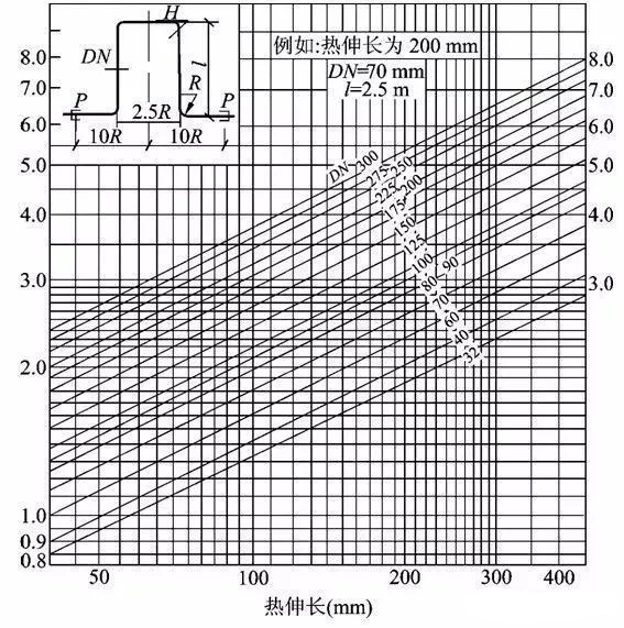 為簡化計算,常用線算圖來確定L型補償器的短臂長度和Z型補償器的中間臂長度。圖二(1)是L型彎管段自然補償線算圖,(2)是Z型彎管段自然補償線算圖。