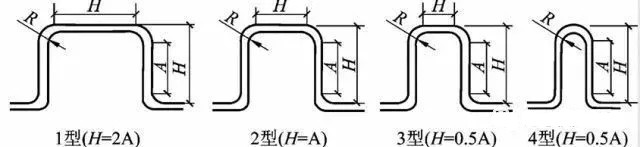 方形補償器通常是由四個90°無縫鋼管煨彎或機制彎頭構成的U型補償器,依靠彎管的變形來補償管段的熱伸長。方形補償器制造、安裝方便,不需要經常維修,補償能力大,作用在固定點上的推力(即補償器的彈性力)較小,可用于各種壓力和溫度條件,缺點是補償器外形尺寸大,占地面積多。為了提高補償器的補償能力(或減少其位移量)常采用預先冷拉的辦法,一般預拉伸量為保溫管道伸長量的50%。在極限情況下,其補償能力可比無預拉時提高一倍。圖三是計算鋼制方形補償器的線算圖,圖四是方形補償器的類型圖。